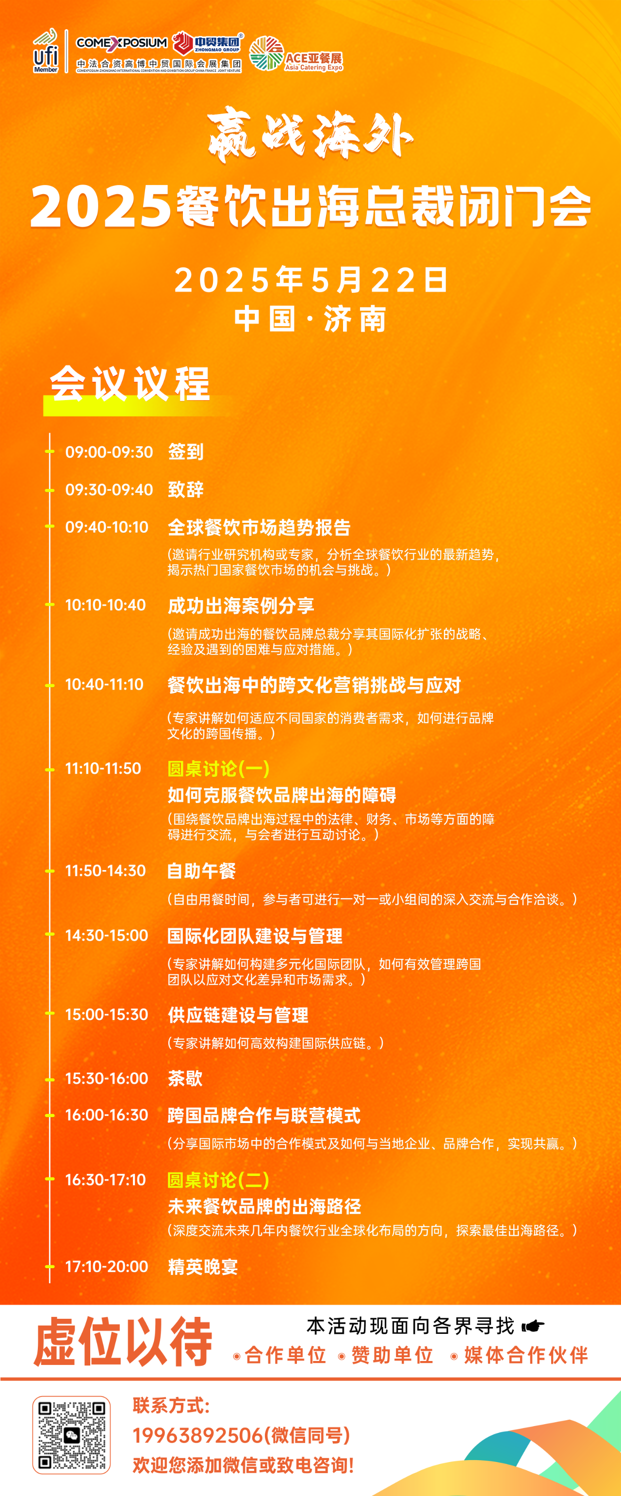 為更好的服務餐飲產(chǎn)業(yè)鏈企業(yè)出海,餐食界計劃在ACE2025第三屆亞餐展期間舉辦“贏戰(zhàn)海外——2025餐飲出??偛瞄]門會”,以實戰(zhàn)經(jīng)驗講透餐飲出海,為餐飲企業(yè)、白酒企業(yè)、茶飲企業(yè)出海提供更多價值參考與借鑒。活動暫定5月22日在濟南舉辦。